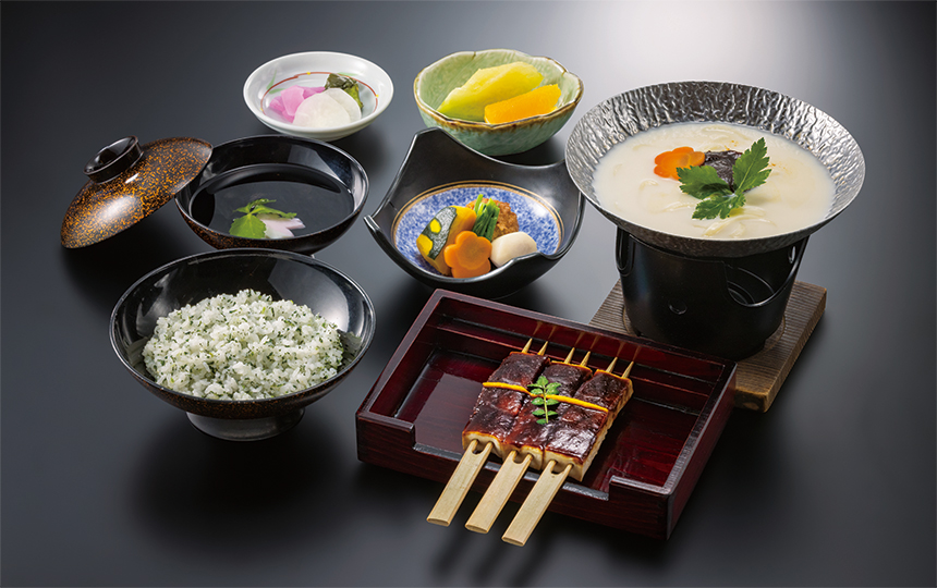 ・田楽(3本) ・豆乳うどん ・小鉢 ・なめし ・吸い物 ・香の物 ・フルーツ