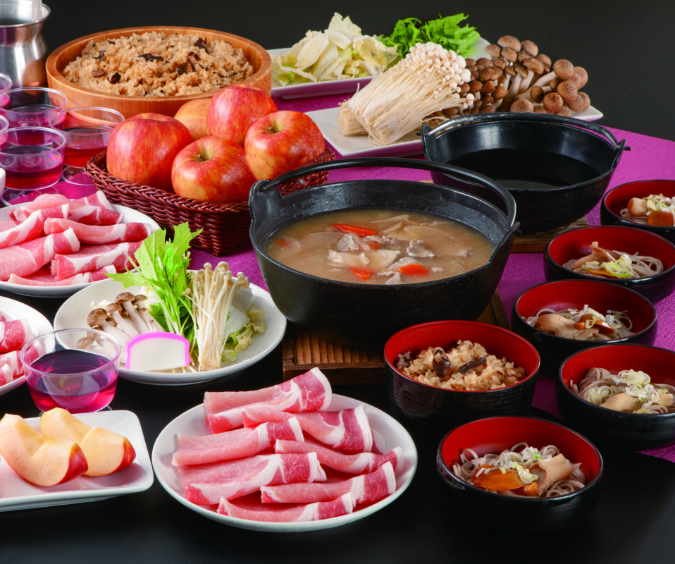 ①豚しゃぶ ②五目御飯 ③信州そば ④豚汁 ⑤りんご ⑥寒天ゼリー
