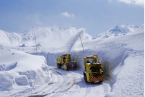 豪雪地帯の室堂ターミナル付近の道路に降り積もった雪の中、上から少しずつ削るようにして道を作ります。