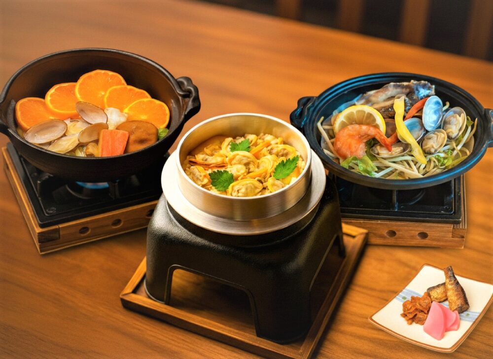 【お品書き】・あさり釜飯 ・海鮮みかん鍋 ・海鮮陶板焼き ・口取り3点盛り