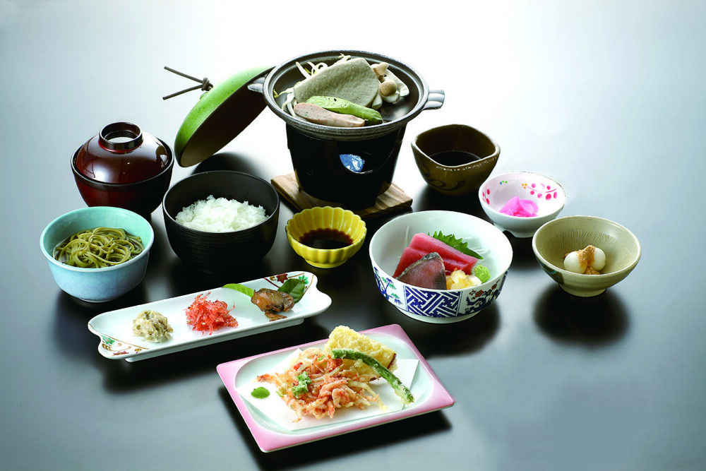 ・陶板焼き(黒はんぺん・桜えび餃子等)・茶そば・味噌汁・ご飯・漬物・安倍川餅